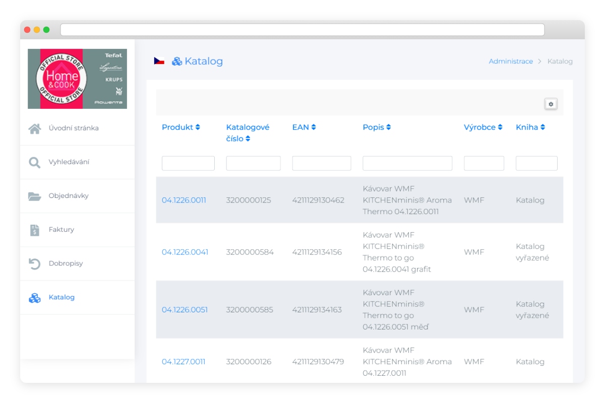 Klient provozuje e-shop s kuchyňskými spotřebiči a potřeboval webové rozhraní pro interní tým, které umožní rychlý přístup k datům z ERP systému Vario — objednávky, faktury, reklamace, skladové pohyby a produktový katalog. Požadavkem bylo řízení přístupu podle rolí, podpora více regionálních poboček (CZ, SK, HU) a napojení na sledování zásilek.