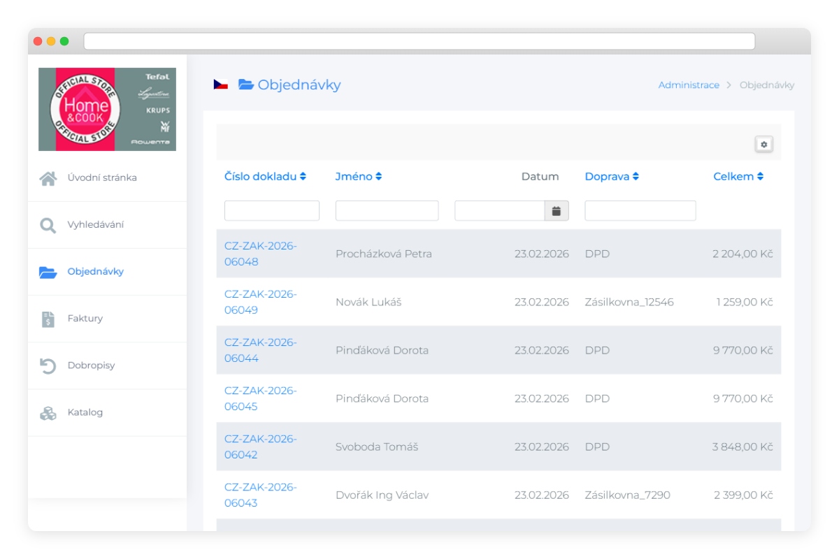 Přehled zakázek, faktur, dobropisů, reklamací a vrácení. Každý doklad má detail s položkami, stavy a celkovými částkami. Řazení a filtrování podle všech sloupců.