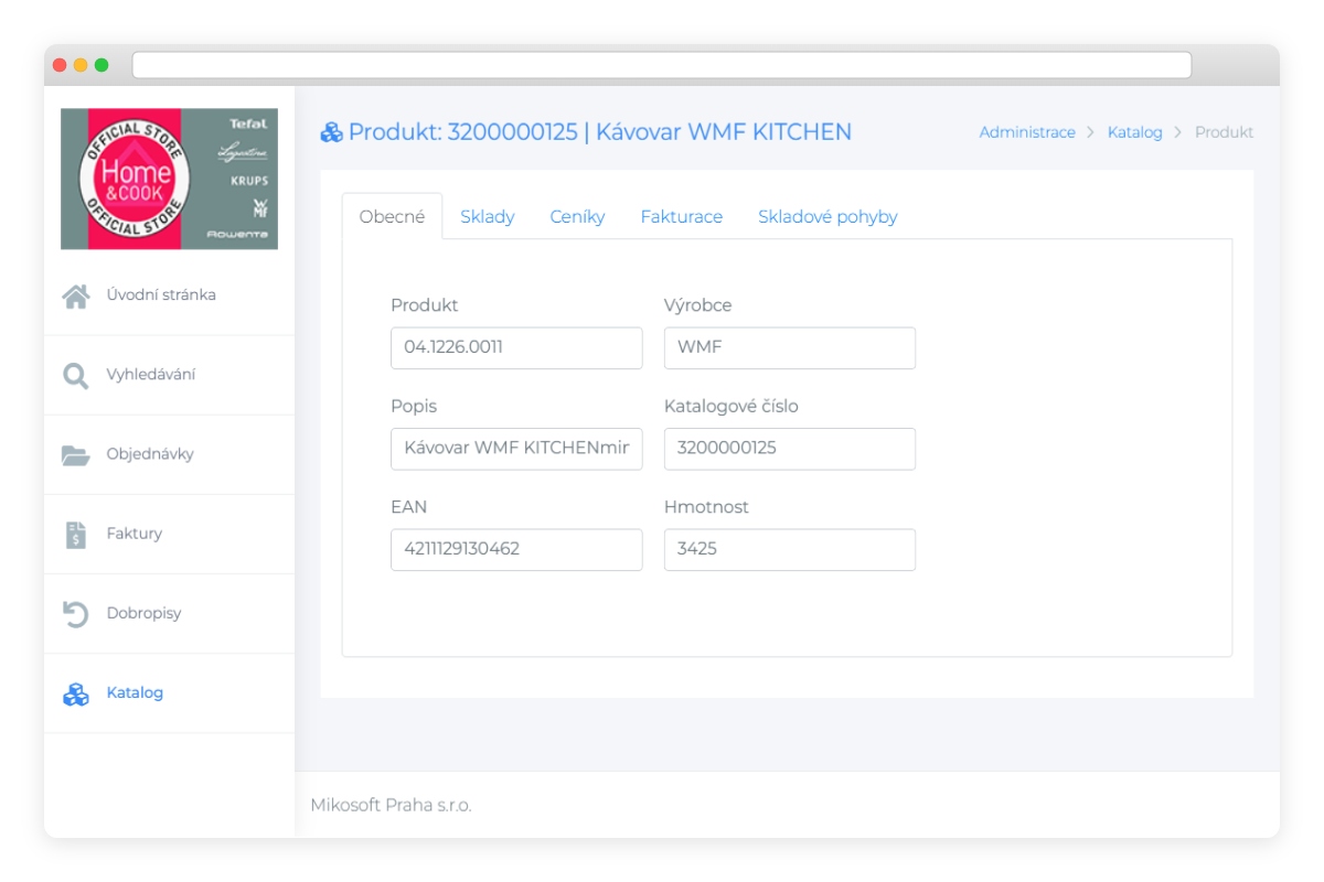 Kompletní produktový katalog s katalogových čísly, EAN kódy, výrobci a skladovými informacemi. Detail produktu zobrazuje zásoby po skladech, ceníky v různých měnách, historii fakturace a skladové pohyby.
