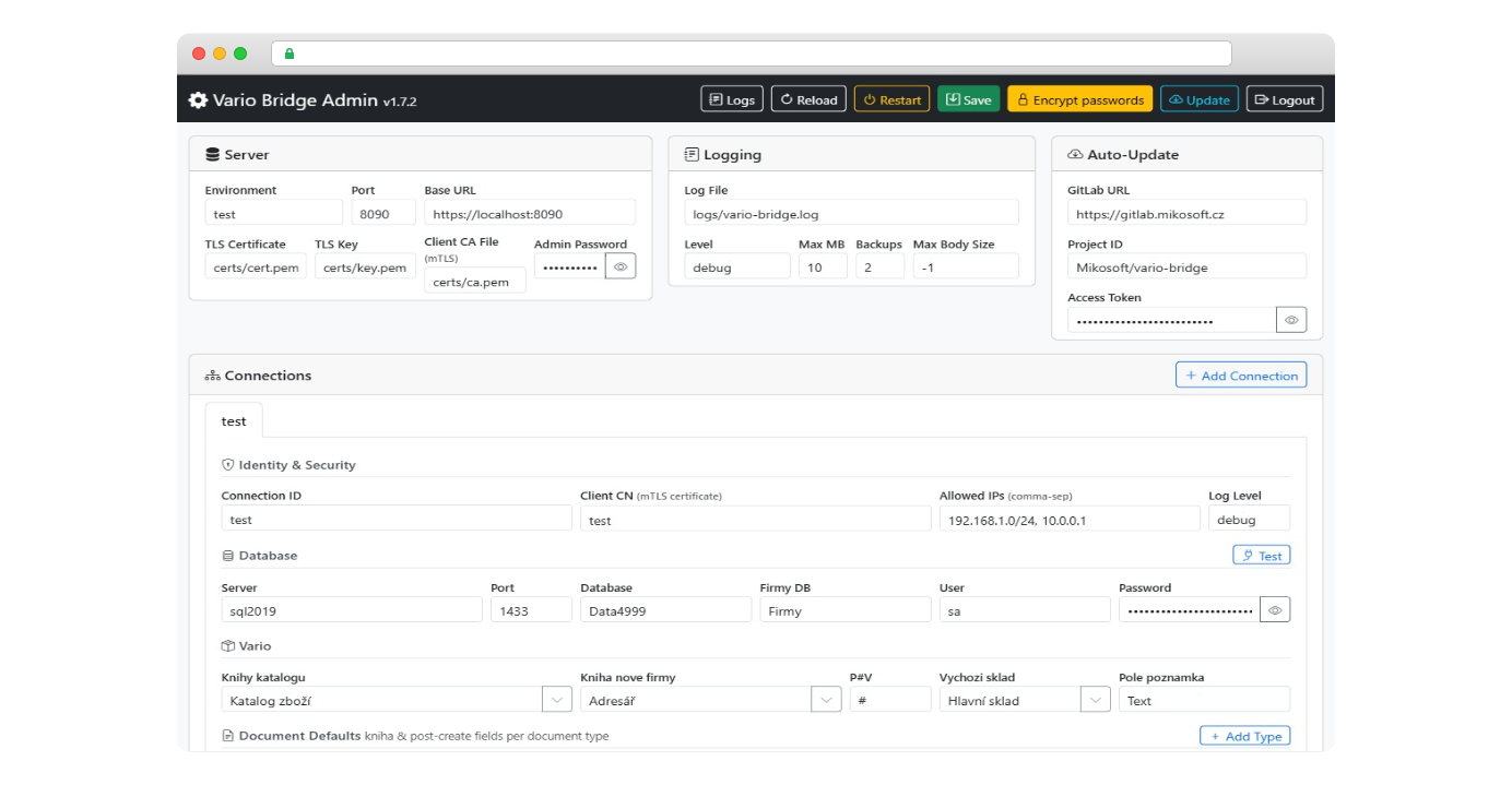 Webové rozhraní pro kompletní správu konfigurace: nastavení serveru, TLS certifikáty, připojení k databázím, konfigurace Vario knih a workflow. Změny se aplikují okamžitě pomocí hot-reload — bez nutnosti restartu služby.