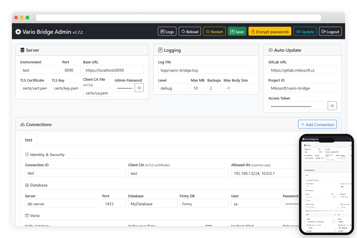Bridge běží jako systémová služba na Linuxu i Windows. Aktualizace probíhají automaticky z GitLab repozitáře — nová verze se stáhne, ověří a nasadí. V případě chyby proběhne automatický rollback. Logy se rotují s konfigurovatelnou velikostí a počtem záloh.