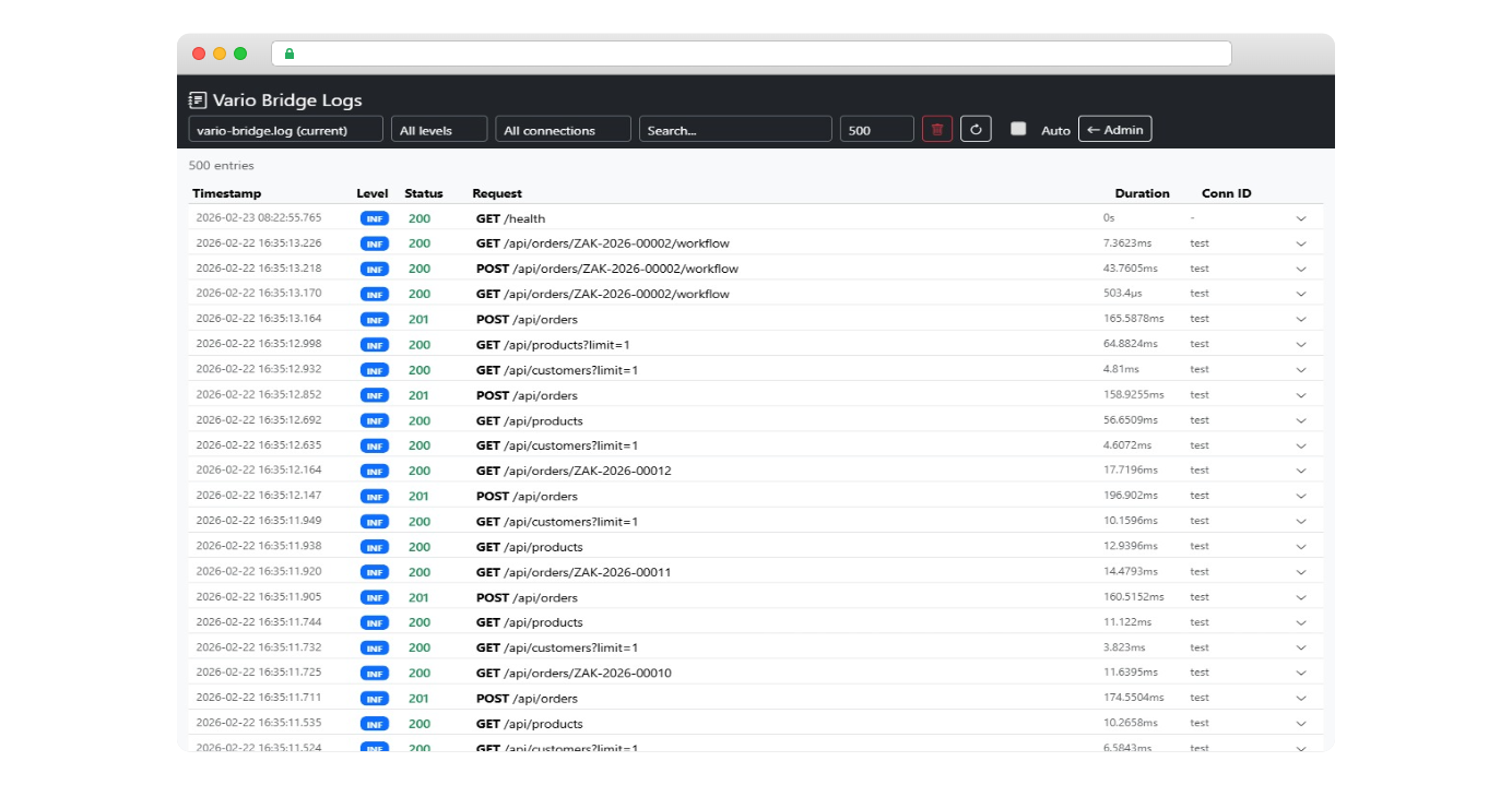 Integrovaný log viewer zobrazuje všechny API requesty v reálném čase. K dispozici je filtrování podle log levelu (debug/info/warn/error), podle připojení i fulltextové vyhledávání. Každý záznam obsahuje timestamp, HTTP metodu, endpoint, status kód, dobu odezvy a ID připojení.