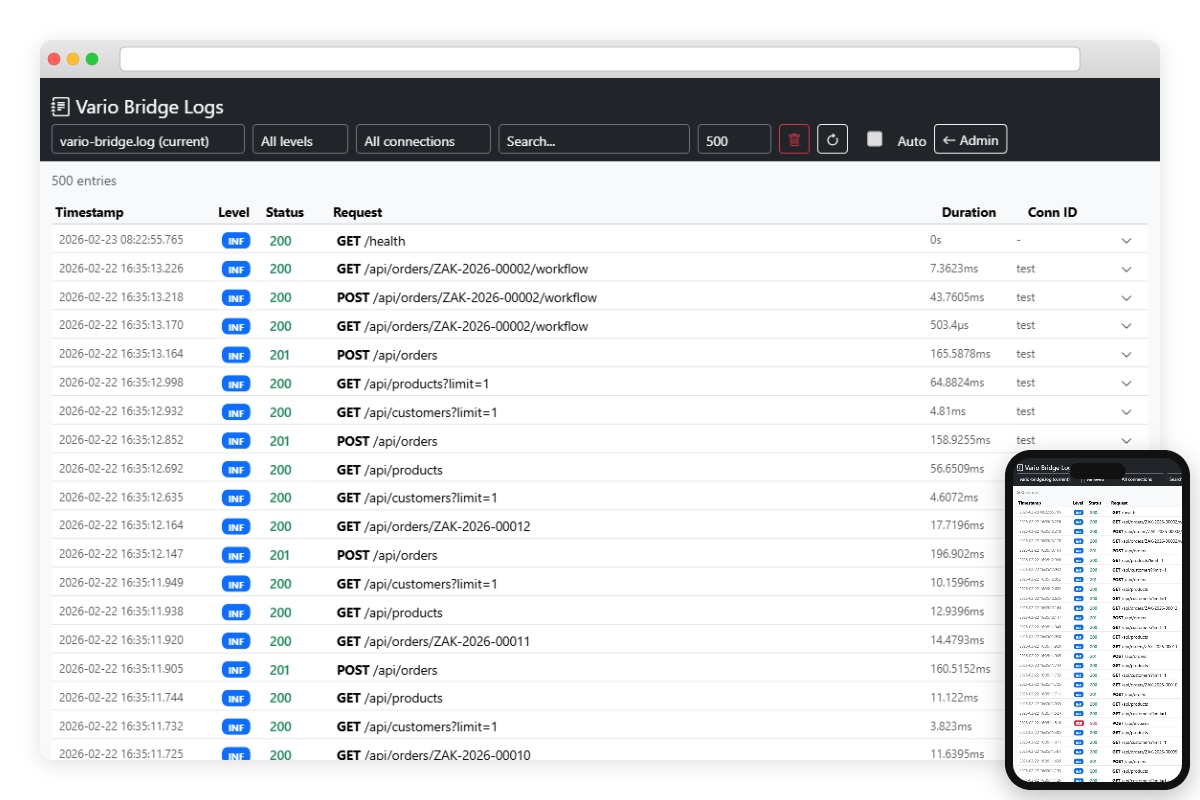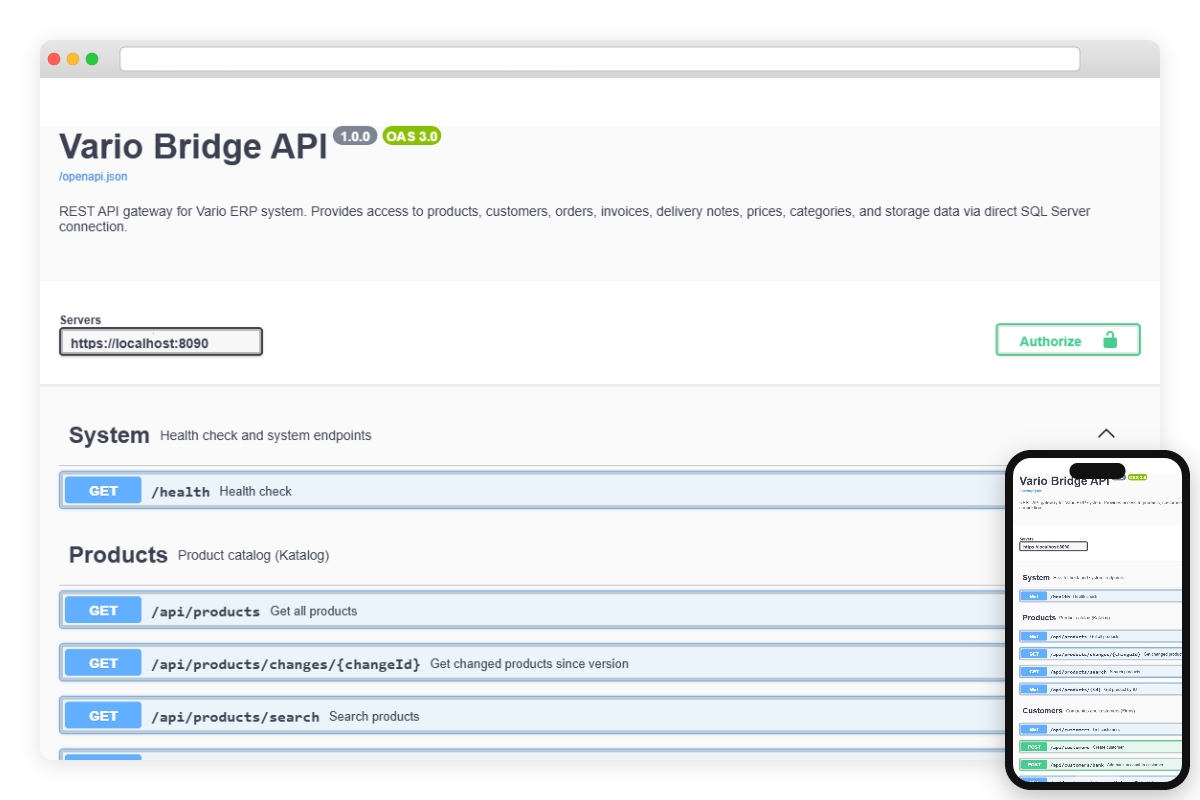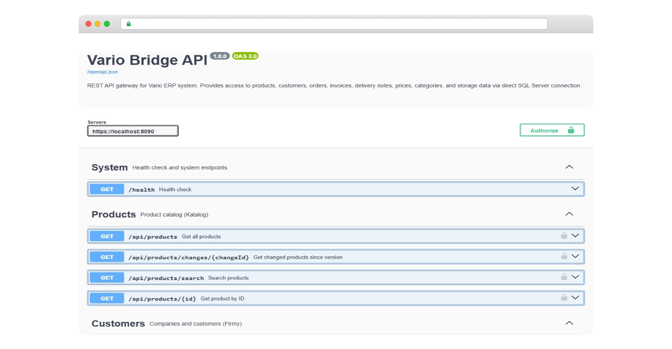 Vyvinuli jsme Vario Bridge — gateway napsaný v Go, který se připojí přímo k SQL Server databázi Vario a zpřístupní její data prostřednictvím REST API. E-shop nebo jakýkoli jiný systém komunikuje přes standardní HTTP requesty a dostává odpovědi ve formátu JSON — bez přímého přístupu k SQL, bez znalosti interní struktury databáze.